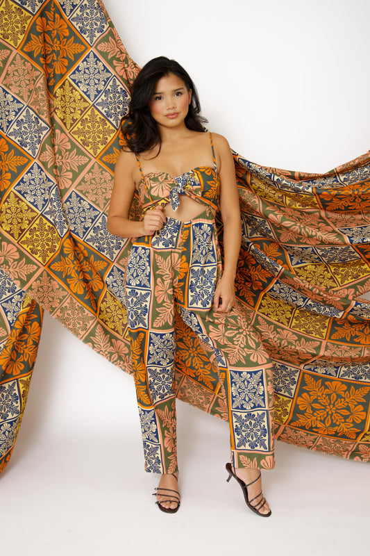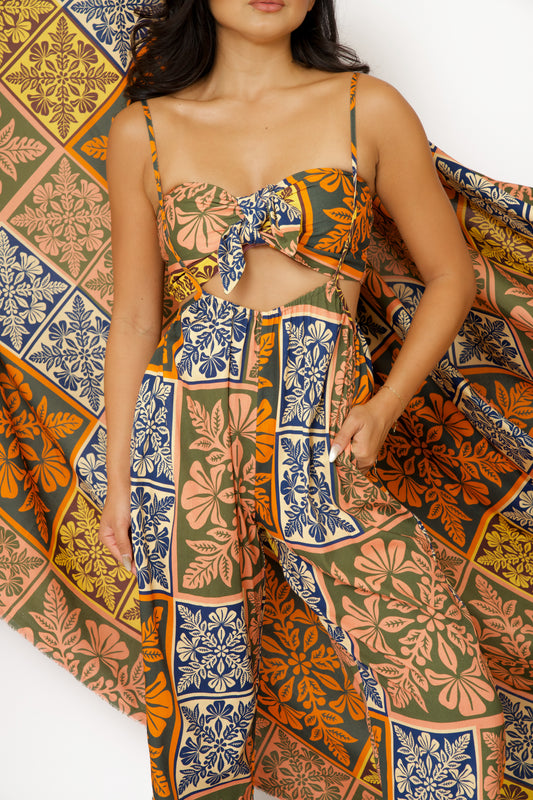The Keila Two-Piece Jumper is the perfect summer outfit, featuring a trendy matching set of a tie bandeau and stylish jumper pants. This versatile outfit allows you to show off some skin, while keeping you on trend. Elevate your wardrobe with this must-have two-piece set.