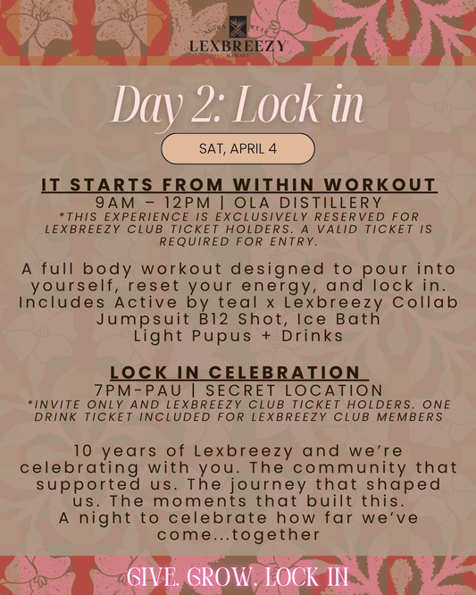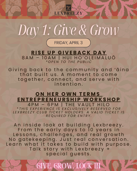 We begin with community — giving back to the people and place that shaped us. We gather to share, learn, and talk story — honoring the journey behind Lexbreezy. Then we move, reset, and pour back into ourselves — mind, body, and energy. And we close by celebrating how far we’ve come, together. Whether it’s entrepreneurship, motherhood, or everything in between — this is a moment to reconnect, reflect, and step into what’s next. Honoring where we started, where we’ve been, and where we’re going.