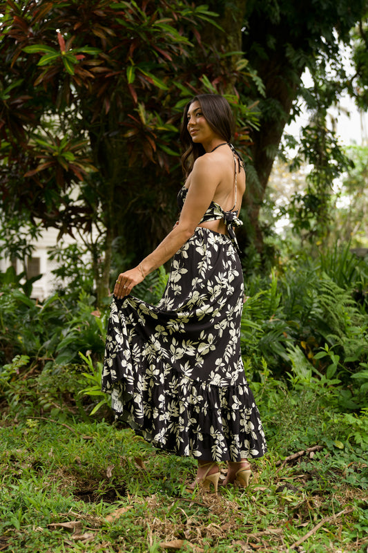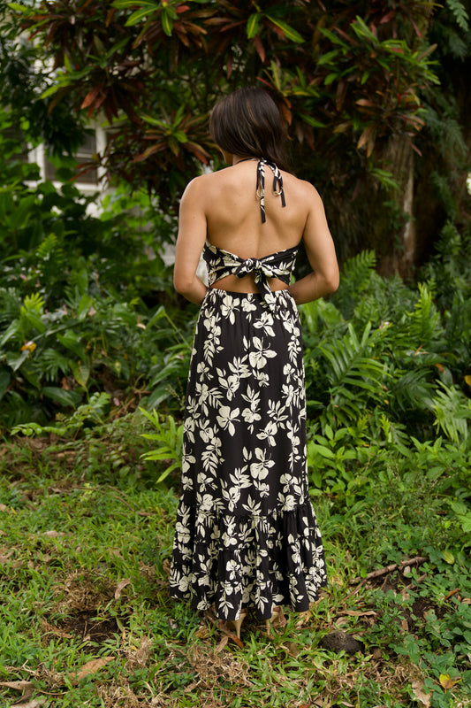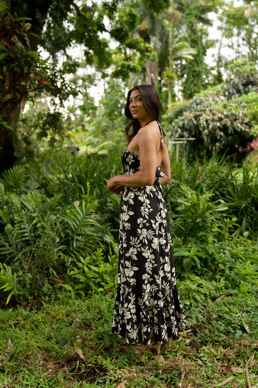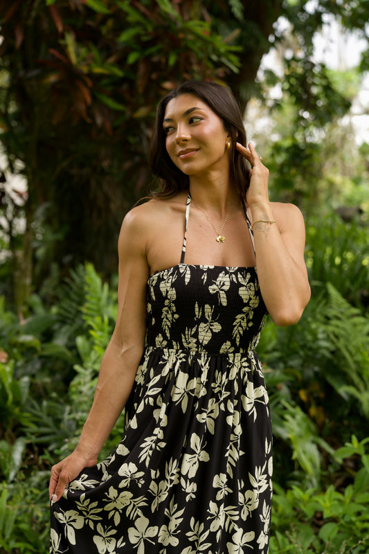 The Anuhea Dress features a chic halter top with a smocked bodice that creates beautiful definition, flowing into an elegant skirt for effortless movement. The standout back detail adds a modern, on-trend touch perfect for any occasion.