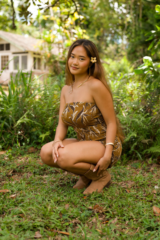 The Maile Romper is here for our 2026 Merrie Monarch Collection. This strapless smocked romper is effortlessly chic—throw it on and pair it with your favorite boots for an instant elevated look we're loving this season.