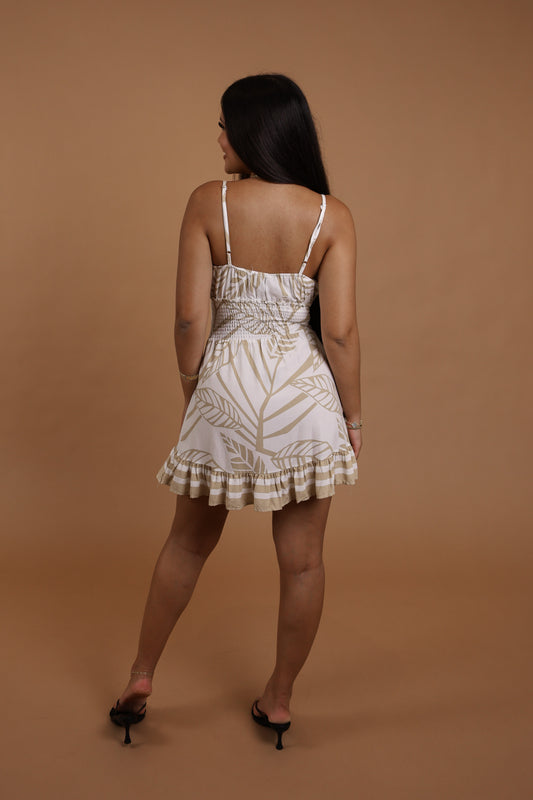 The Hulali Tie Dress combines effortless elegance with playful charm. This flowy mini silhouette features a flattering front V-neck with a delicate tie detail that adds dimension and movement. The ruffled hemline creates a fun, flirty finish perfect for casual outings or island-inspired occasions.