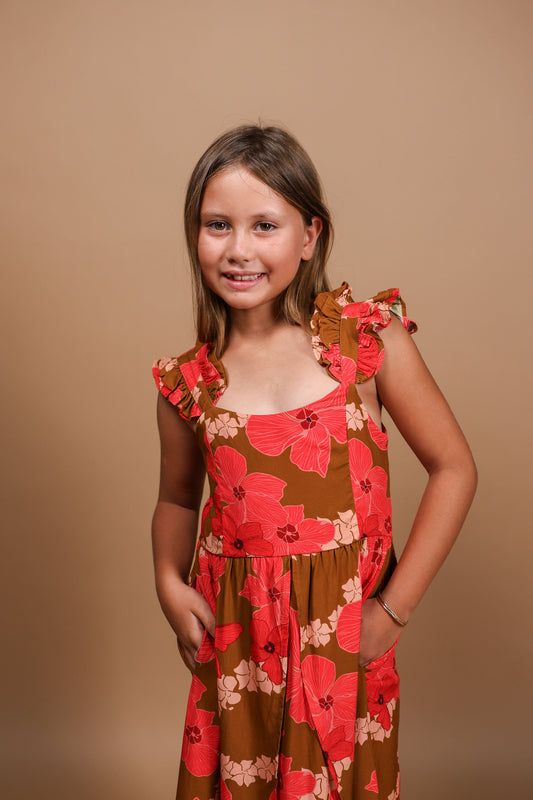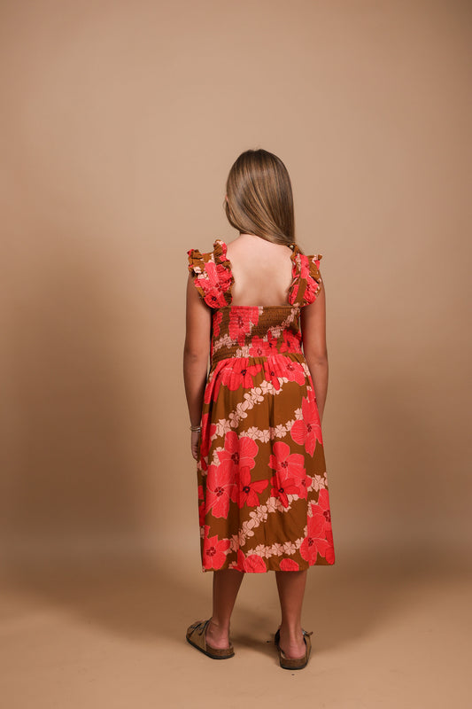 Introducing the Miss Aloha Dress in a keiki version. This stunning midi dress features ruffled sleeve detail to keep your keiki on trend. Play dress up in our newest style and pair with our matching women's pieces!